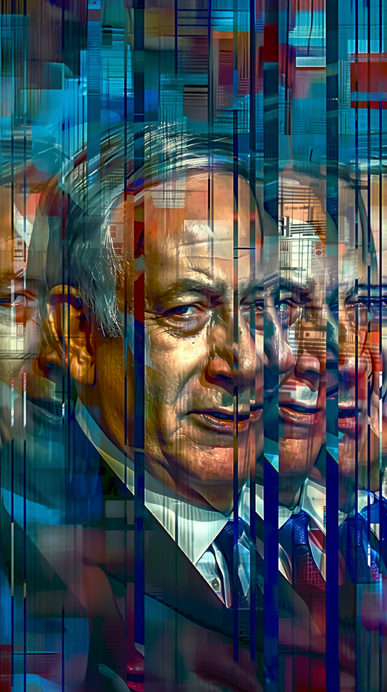 The Prerogatives of Power is a multi-screen installation that displays AI generated glitch portraits of political leaders from around the world (Putin, Trump, Zelensky, Xi Jinping, etc). The AI diffusion models result in portraits based on a fusion of many sources and the output images are fed backed into the AI image generator for multiple iterations producing the final result. This series is a critique and warning of the use and abuse of power by authoritarians the world over. The Prerogatives of Power is inspired by Antonio Muntadas’ 1987 installation “The Board Room” and by portrait studies by Frances Bacon.